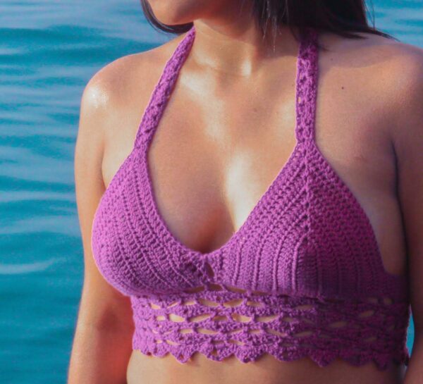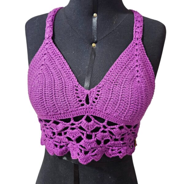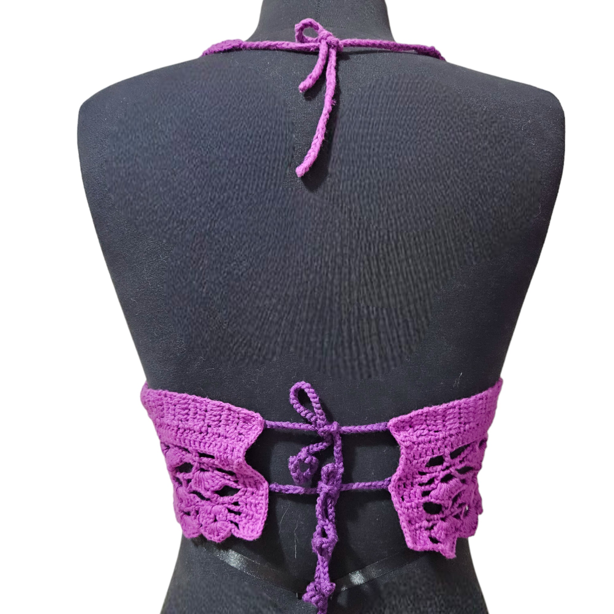 Top casual de mujer morado tejido a crochet talla S, crop top de mujer con tiras, hecho 100% algodón de estilo casual y fit ajustado, sin mangas y con tiras en la espalda y el cuello para el amarre y ajuste perfecto.