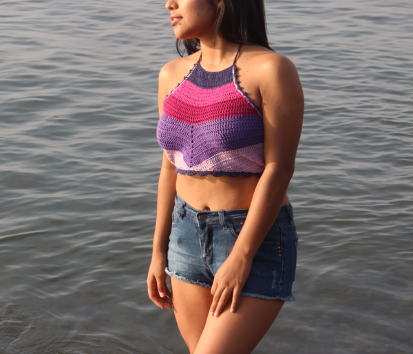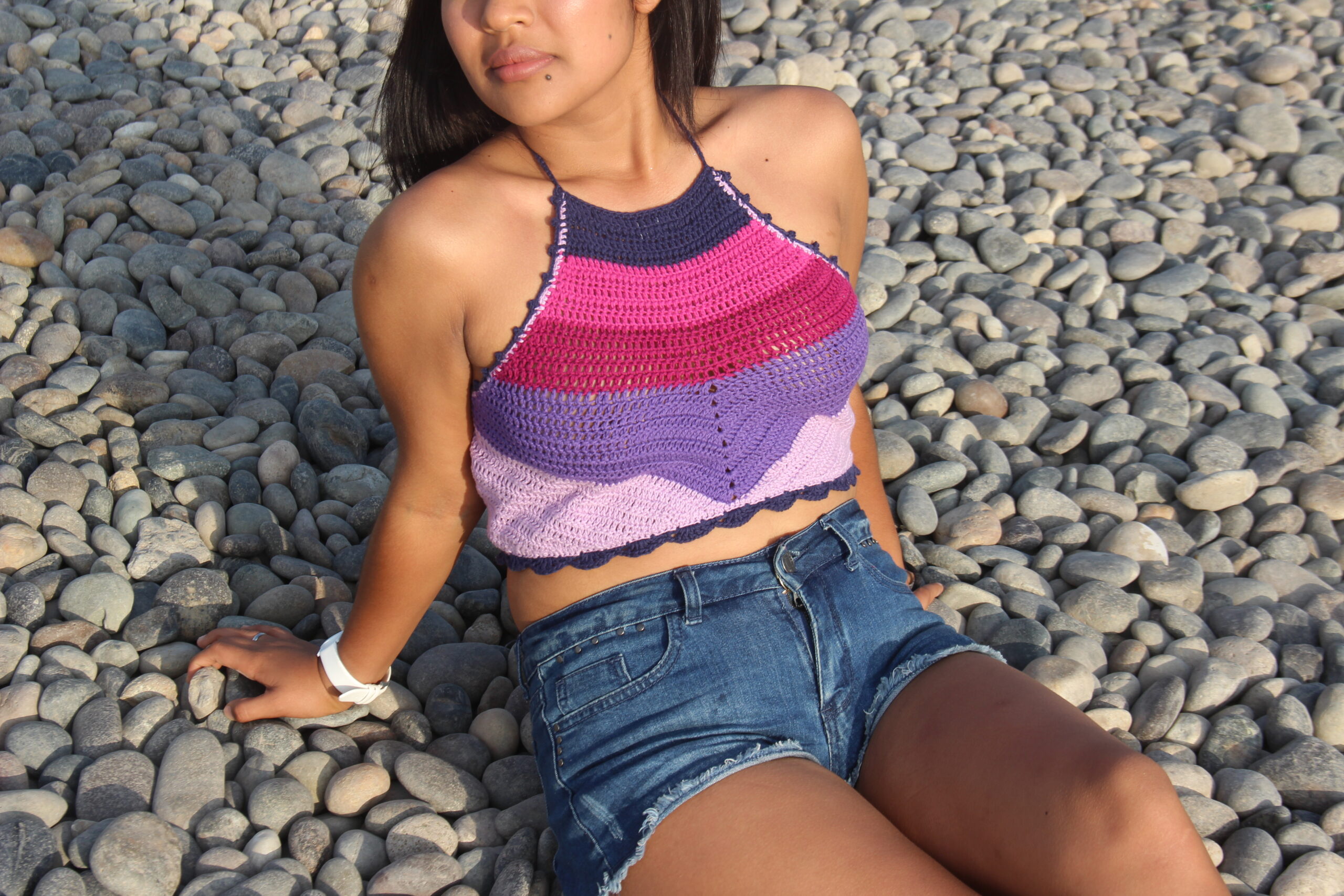 Top casual de mujer multicolor tejido a crochet talla S, crop top con tiras de mujer, hecho 100% algodón de estilo casual y fit ajustado, sin mangas y con tiras en la espalda y el cuello para el amarre y ajuste perfecto.